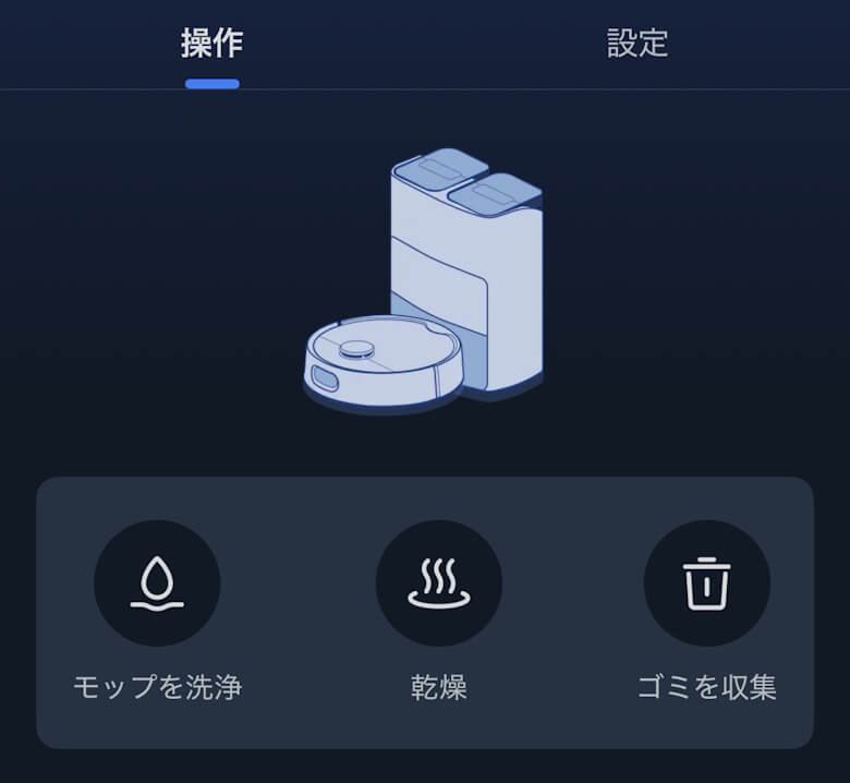 ホーム画面からモップの洗浄や乾燥、各種設定が行えます。