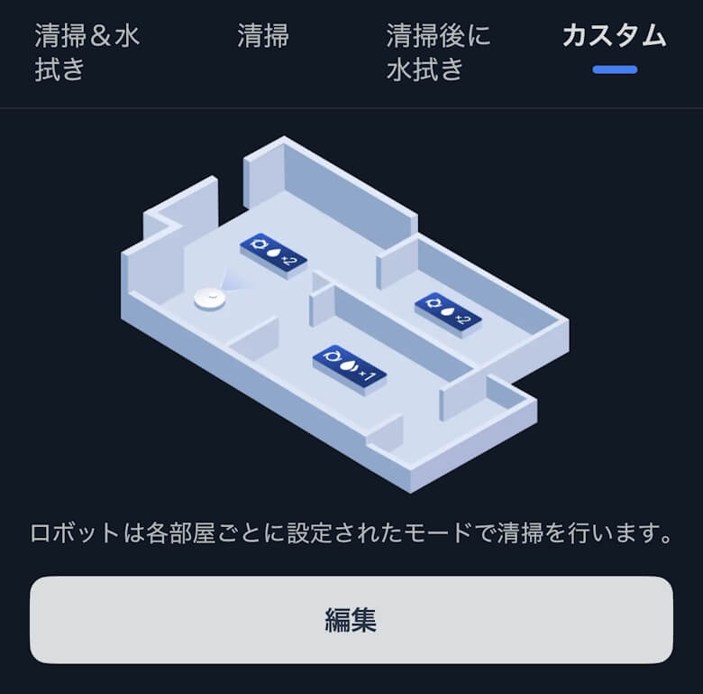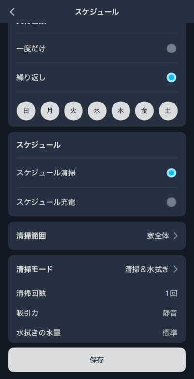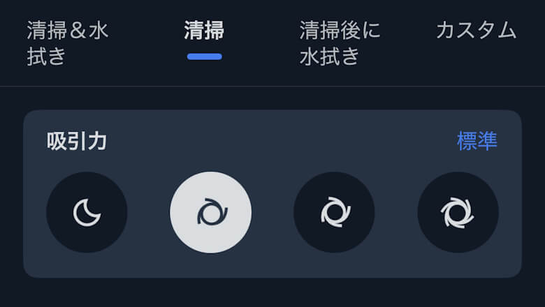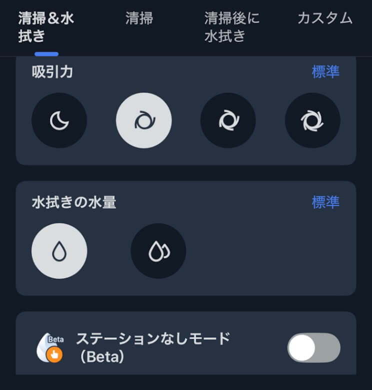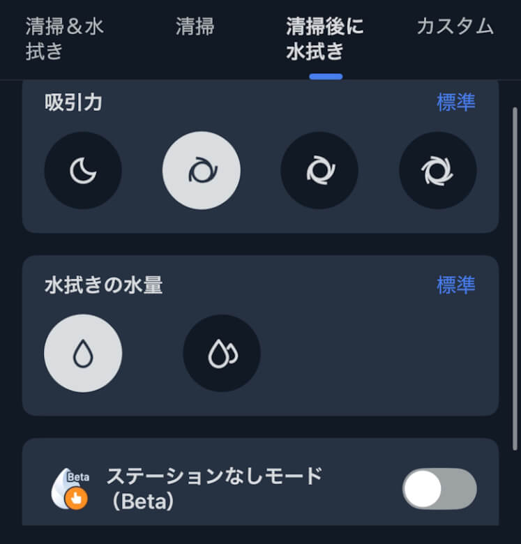 掃除は清掃&水拭き、清掃、清掃後に水拭き、カスタムから選択できます。
