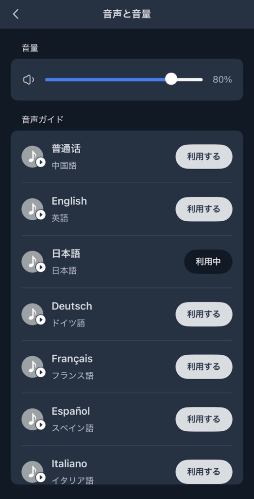 音声と音量は言語を選択できます。