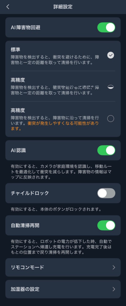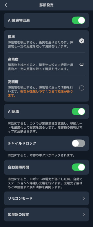AI障害物回避やチャイルドロックなど細かく設定できます。