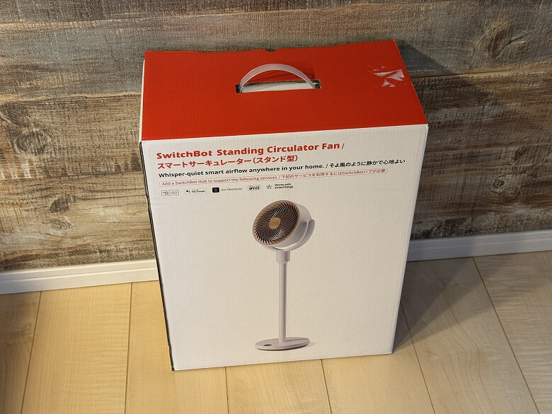 「SwitchBot スマートサーキュレーター(スタンド型)」の外箱は、白基調で赤をアクセントカラーにしたシンプルなデザインです。