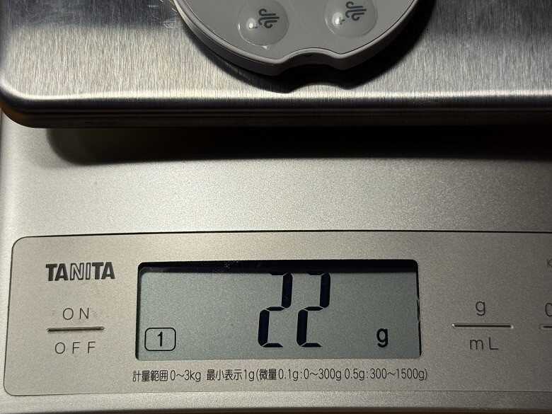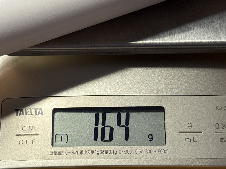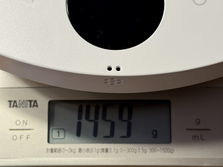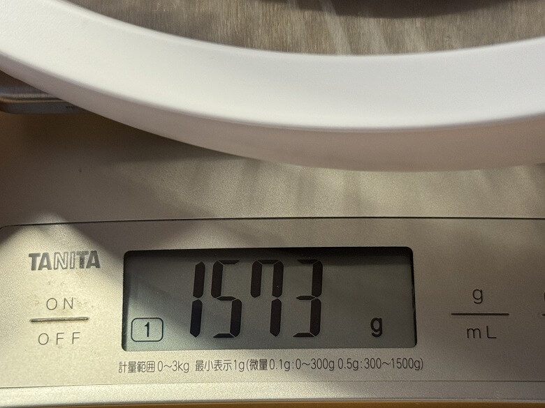 重さは台座が1459 g、上部が1573 g、ポール1本が164 g、リモコンが22 gでした。