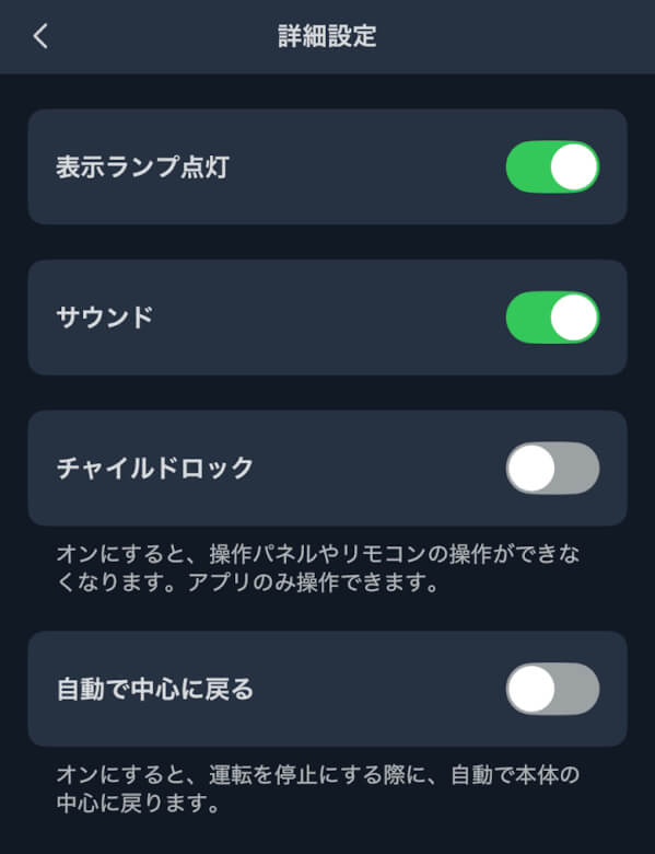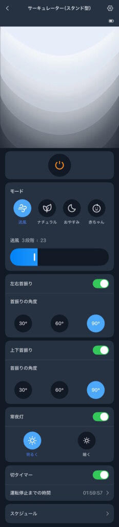 ホーム画面では首振りや常夜灯ON/OFFなど、各種操作が行えます。