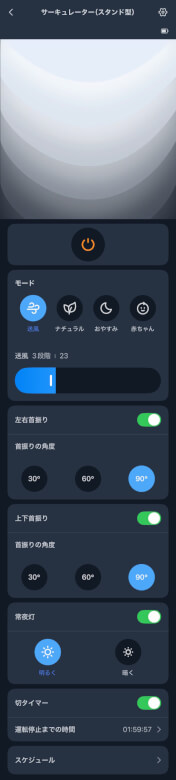 ホーム画面では首振りや常夜灯ON/OFFなど、各種操作が行えます。