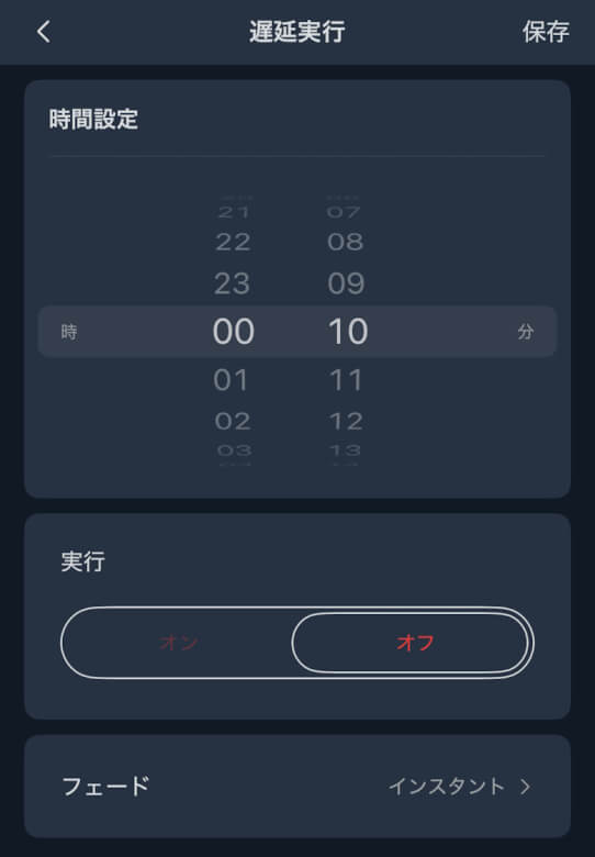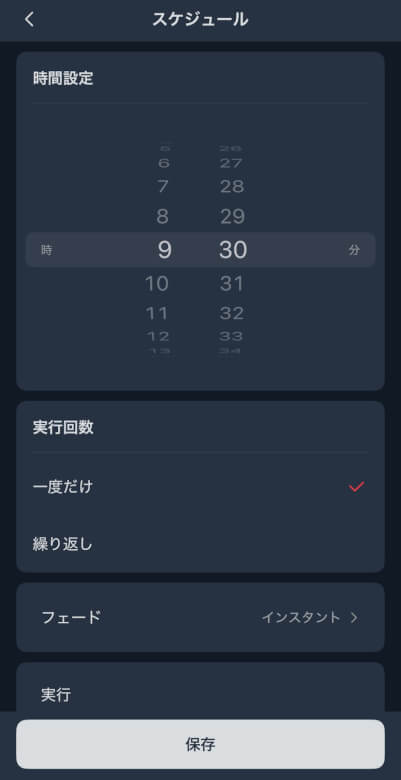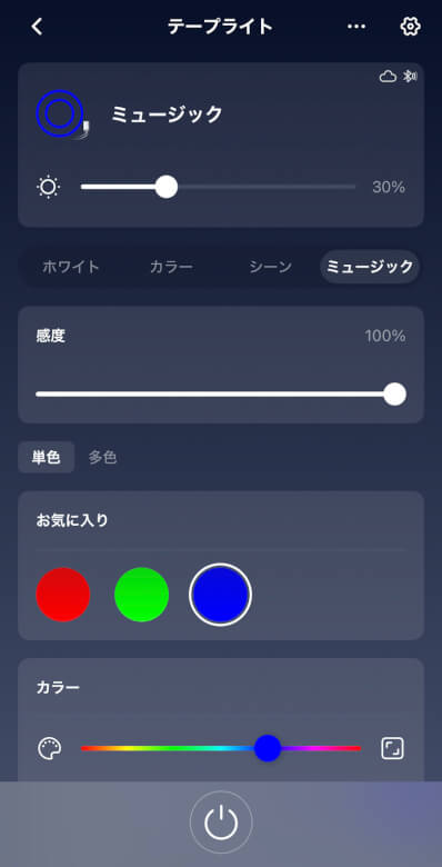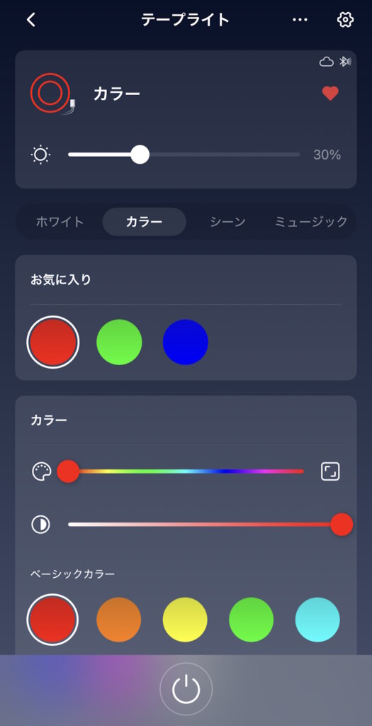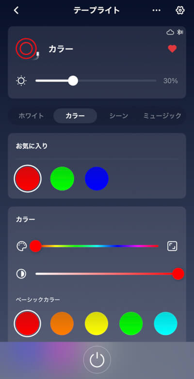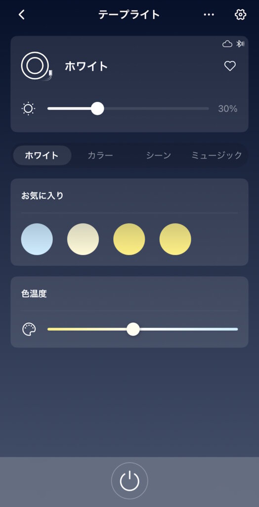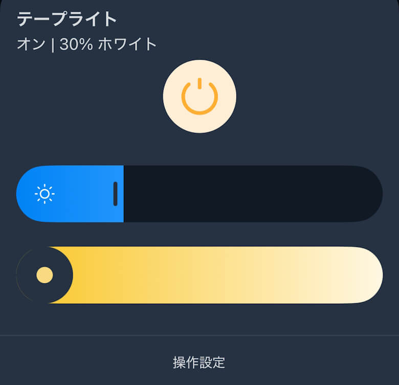 ホーム画面では電源ON/OFFと光量、調光を調整できます。