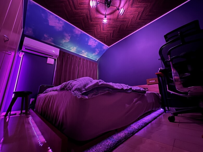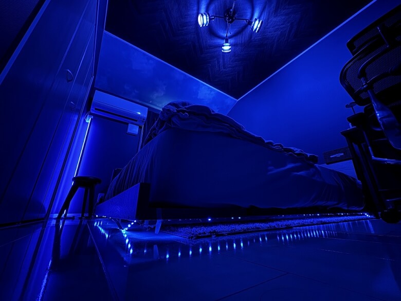 同じSwitchBotの「スマート電球」や「フロアライト」を設置すれば、寝室もあっという間に別の空間かと見間違えるほどにおしゃれになります。