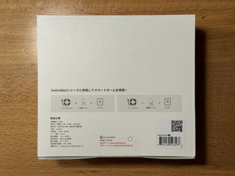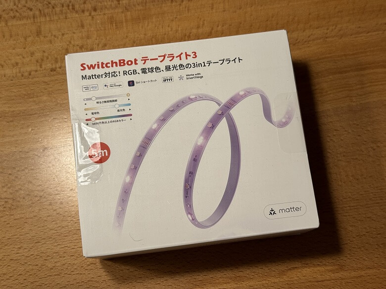 「SwitchBotテープライト3」の外箱は、白基調でシンプルなデザインです。