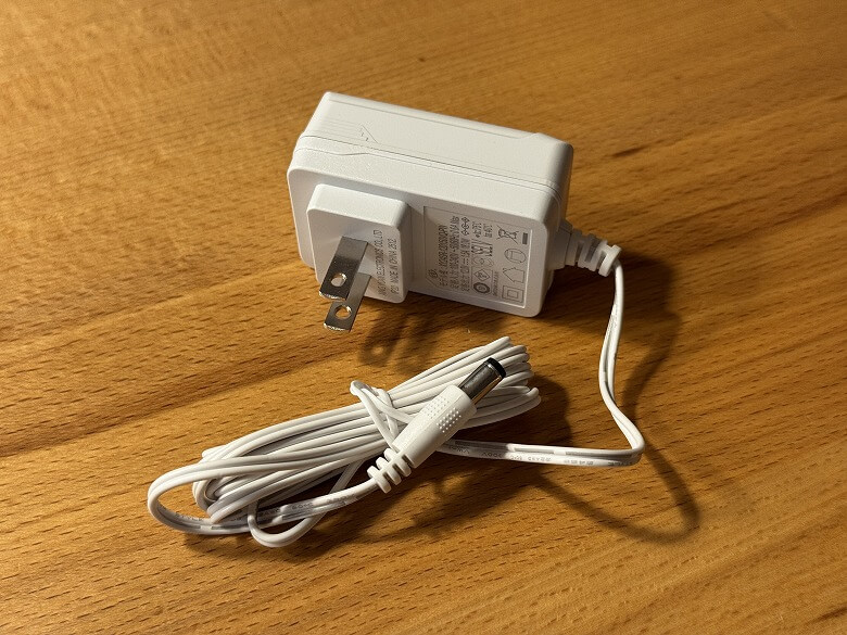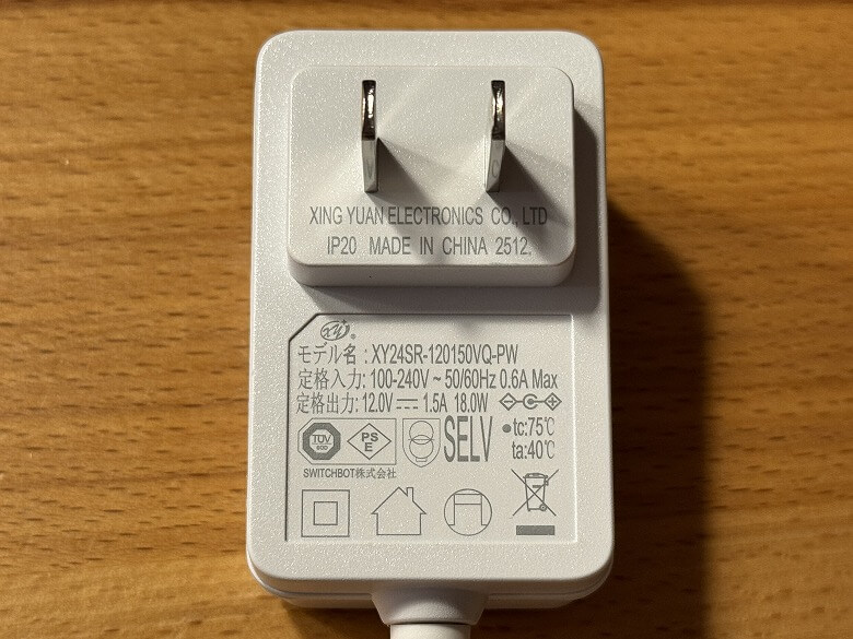 電源アダプターの側面には仕様が記載されています。