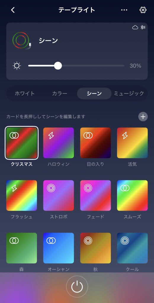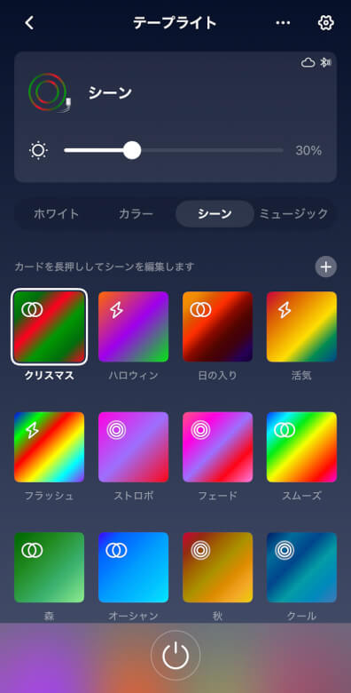 シーンでは“クリスマス”や“活気”といったテーマで切り替わるカラーモードを設定できます。