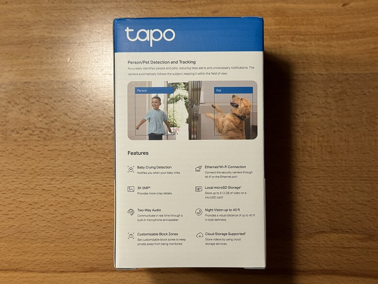 「TP-Link Tapo C232」の外箱は、白基調に青をアクセントカラーにしたシンプルなデザインです。