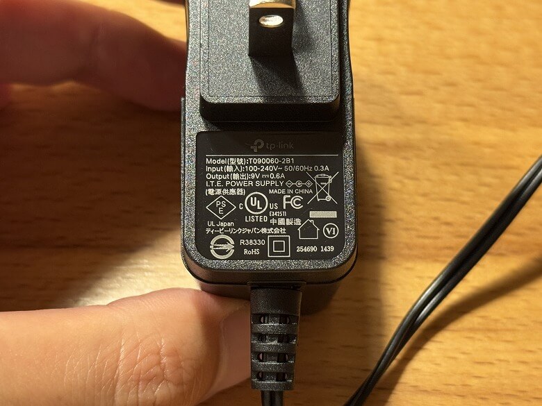電源アダプターの側面には仕様が記載されています。