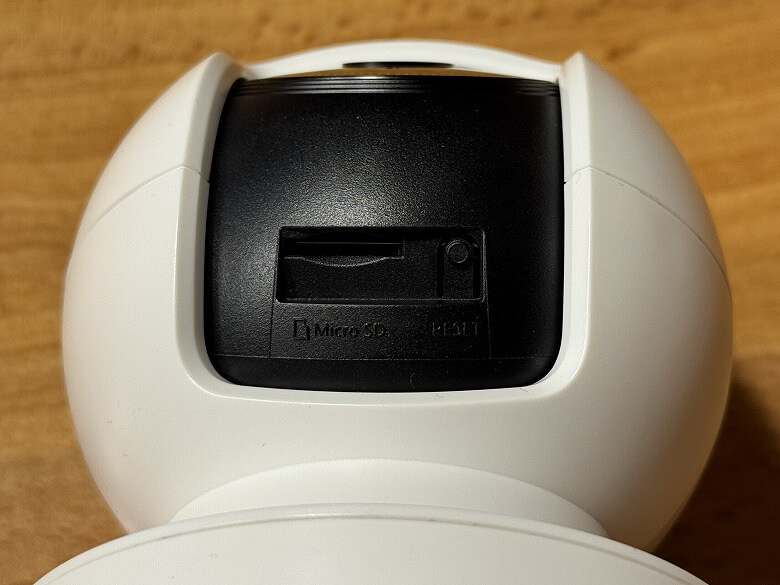 カメラを上に向けると、下側にmicroSDスロットとリセットボタンがあります。