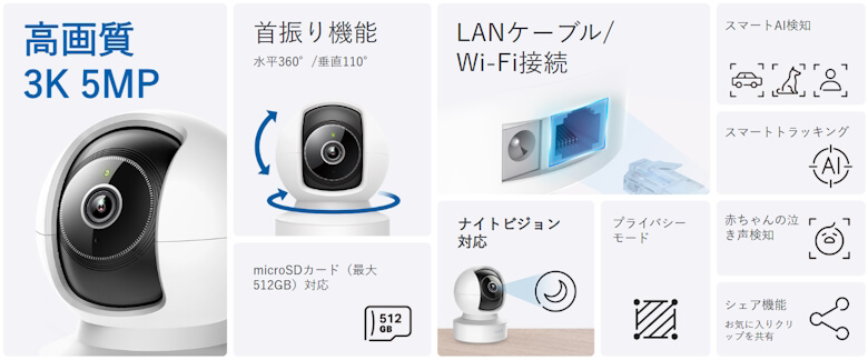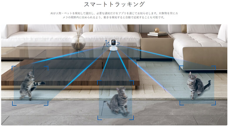 3Kの高解像度映像、パンチルト対応(横360°・縦110°)、AIによる人物・ペット検知や自動追尾、夜間撮影対応の赤外線ナイトビジョン、双方向通話まで搭載という充実ぶり。