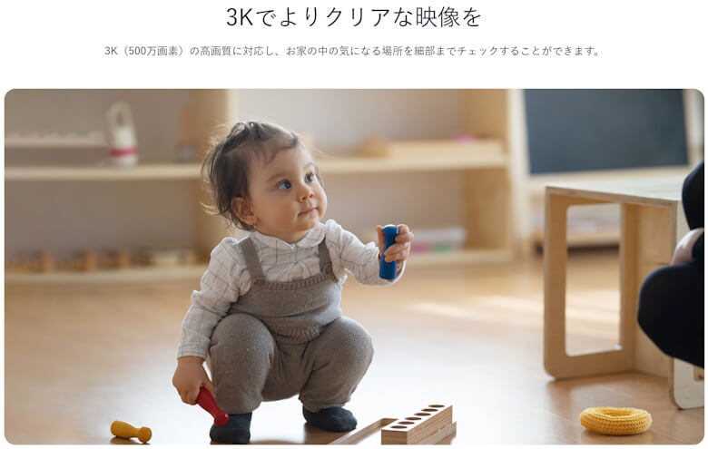 3K (500万画素)の高解像度で、鮮明な映像で細かい部分までチェックできます。
