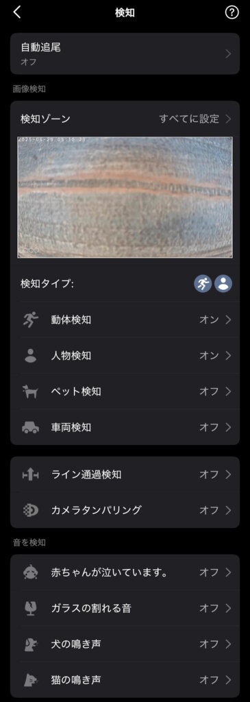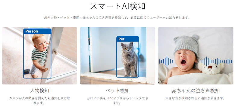 | AI検知 | 動体検知 人物検知 ライン通過検知 タンパリング検知 赤ちゃんの泣き声検知 車両検知 ペット検知 猫の鳴き声検知 犬の鳴き声検知 ガラス破損検知 |