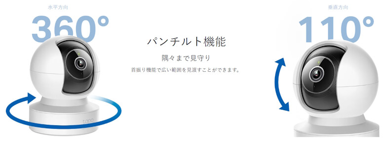 水平方向は360°、垂直方向は110°のパンチルト機能に対応しています。