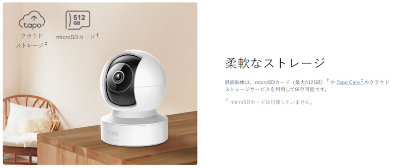 録画映像はmicroSDカード(最大512GB)や、Tapo Careのクラウドストレージサービスを利用して保存可能です。