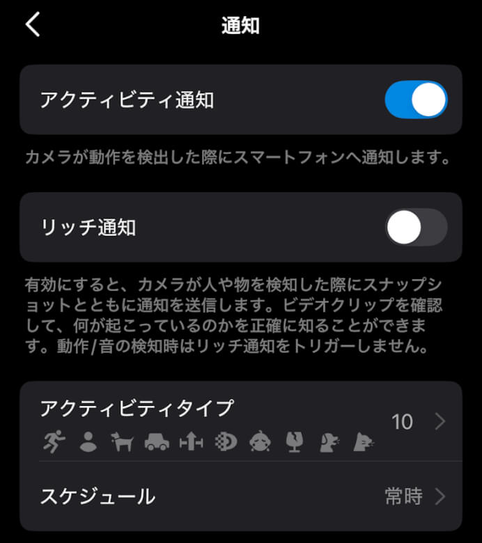 指定したエリアのみの動きを検知するアクティビティゾーンを設定することで、気になるエリアの通知のみを受け取ることができます。