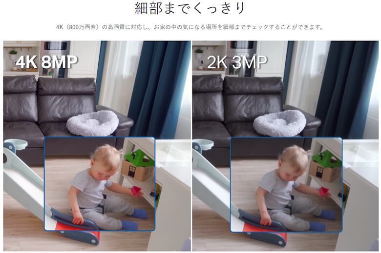 4K (800万画素)の高解像度で、鮮明な映像で細かい部分までチェックできます。