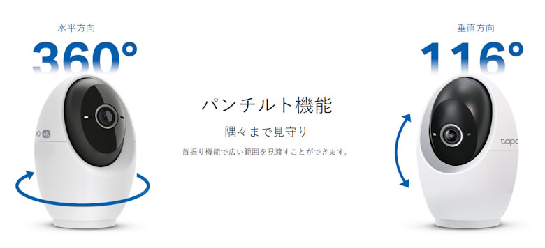 水平方向は360°、垂直方向は116°のパンチルト機能に対応しています。