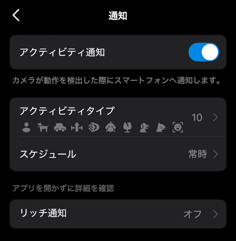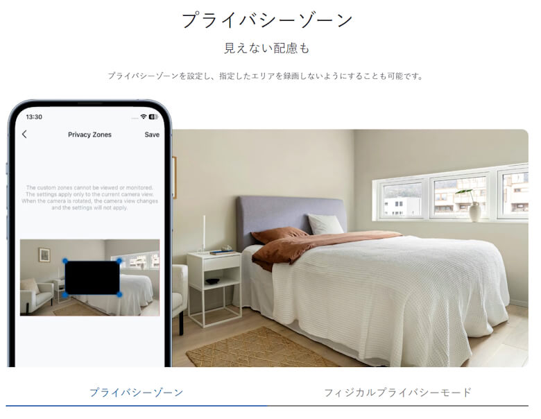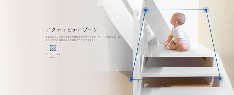 指定したエリアのみの動きを検知するアクティビティゾーンを設定することで、気になるエリアの通知のみを受け取ることができます。