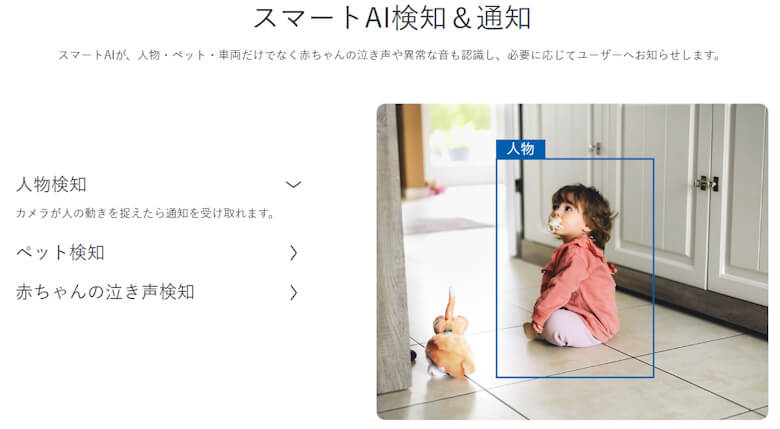 スマートAIが人物やペット、車両だけでなく赤ちゃんの鳴き声や異常な音を検知してユーザーにお知らせします。
