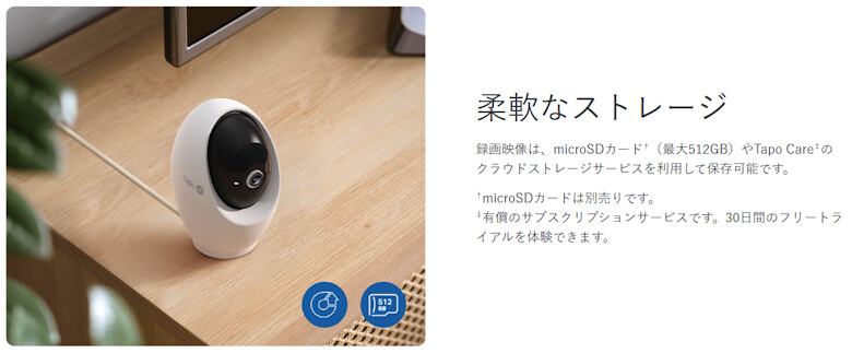 録画映像はmicroSDカード(最大512GB)や、Tapo Careのクラウドストレージサービスを利用して保存可能です。