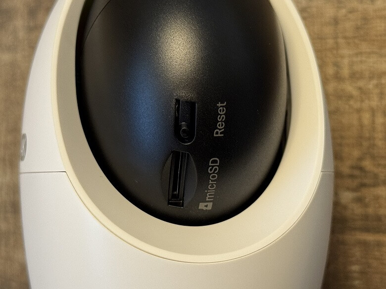 カメラを上に向けると、下側にmicroSDスロットとリセットボタンがあります。
