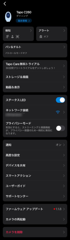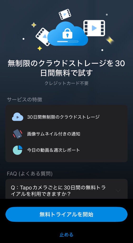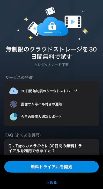 | クラウドストレージ | Tapo Careのクラウドストレージサービス(有償) |