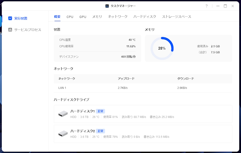 「まだ余力が残っている」と感じられる点は、長く使うNASとして非常に安心感があります。