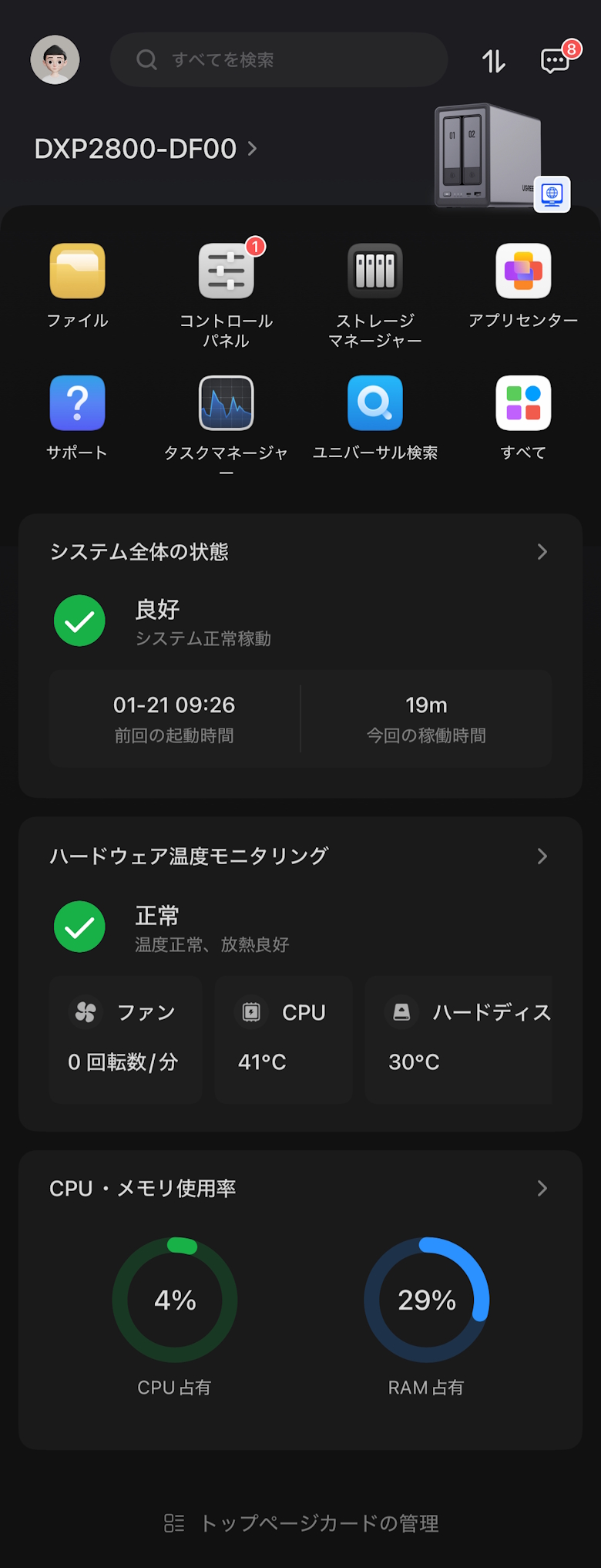 コントロールパネルやストレージマネージャー、アプリセンターなど各種画面から「UGREEN NASync DXP2800」を管理できます。